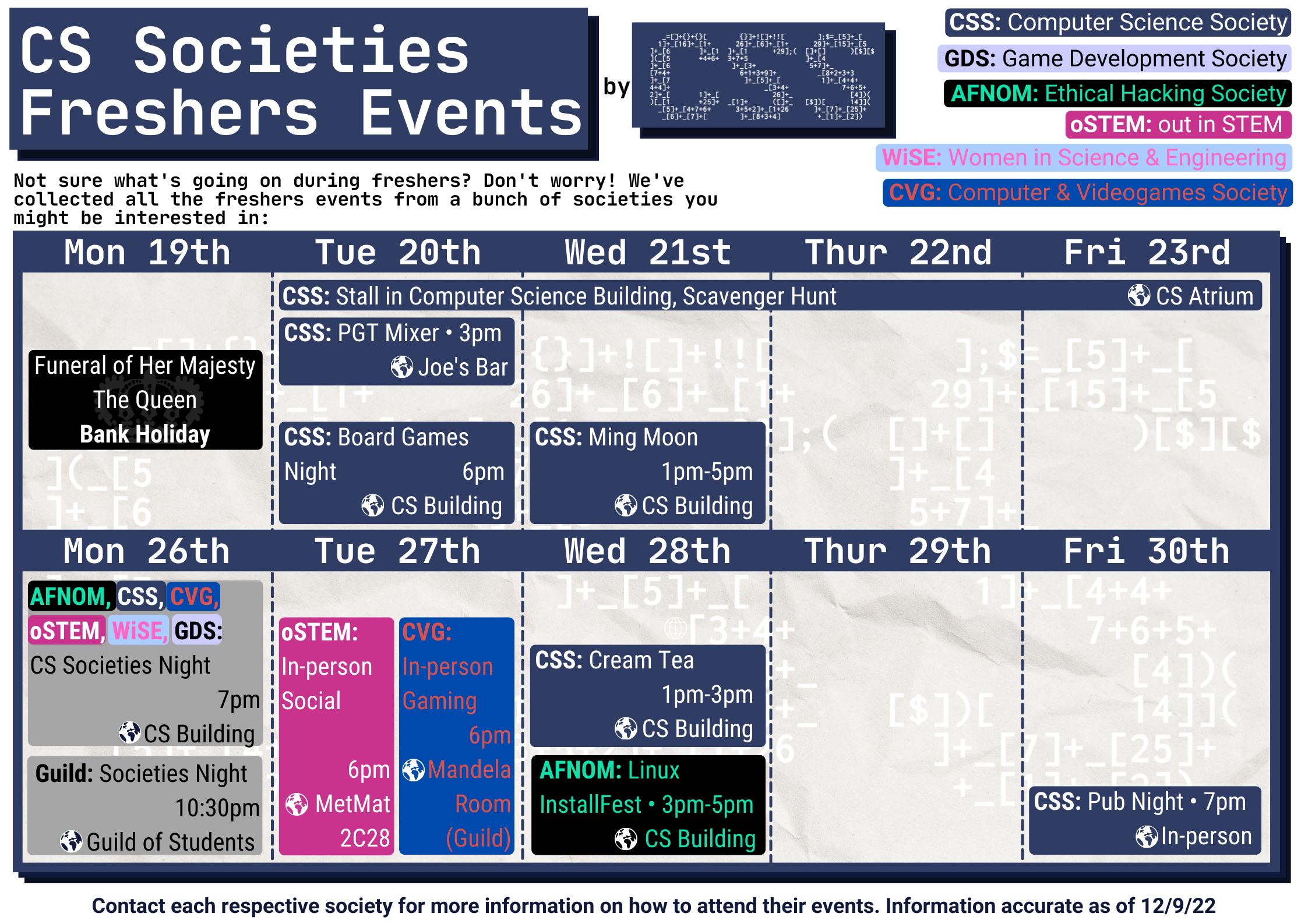 Hello everyone! We hope you’ve had a great Fresher’s Week and are looking forward to starting all of your modules next week. Firstly, congratulations! Congratulations to all of the new First Years, new Masters students, new PhD students and to all of our returning members coming back after the summer 🎉 CSS has got lots of plans and we’re keen to get every one of you involved in something fun and interesting to you. As ever, the best places to find out about our activities are Discord, Instagram and Facebook. We’d especially recommend joining the Discord to meet new people and chat with all the rest of us CS students.